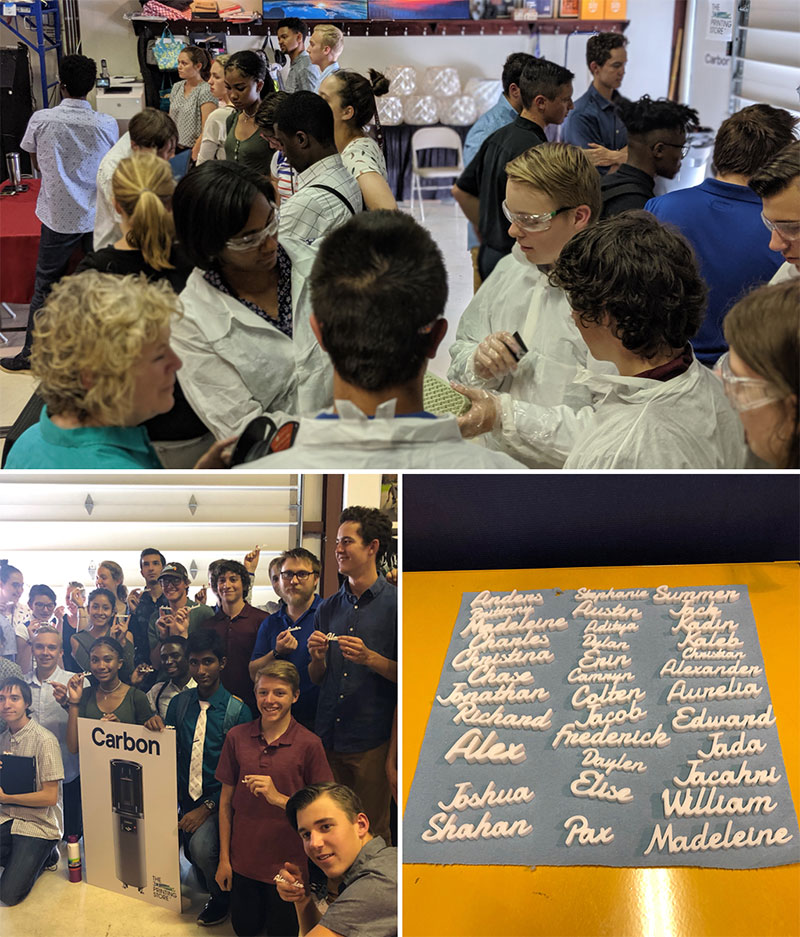 Images of the CSBR aerospace interns learning about Carbon 3D and receiving 3D prints of their names.