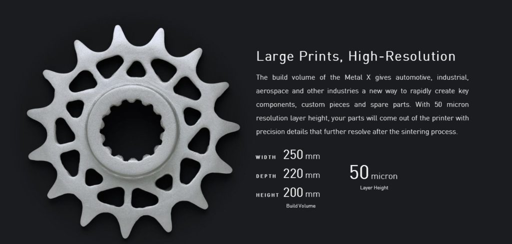 “ADAM prints your part using a bound metal powder rod that transforms into a dense metal part in one easy step. Bulk sintering provides crystal growth through all axes giving your parts excellent mechanical properties in all directions.”